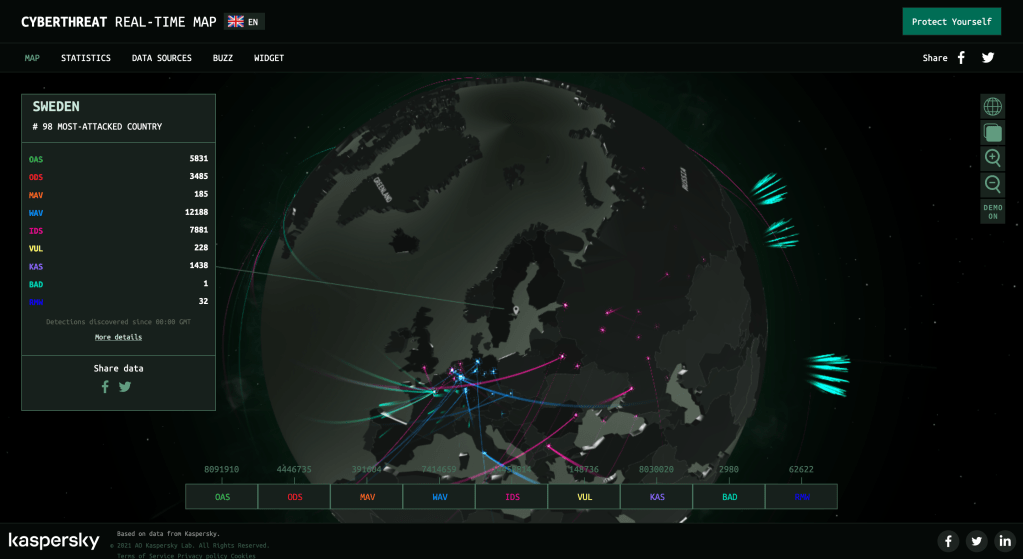 Cyber threat maps can be highly useful in examining past attacks in terms of locations, volumes, and patterns. They can also help someone who is just starting out in their studies to acquire a sense of what is involved in the intricate world of cybersecurity. Last week, I had my introductory lecture on cyber security at Malmö University. I used cyber threat maps in my lecture to help raise awareness of how prevalent cyber security attacks are.