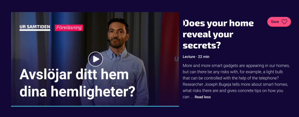 In a televised public lecture, I discuss the smart home, its privacy risks, and what can be done to secure the contemporary home. Here is the link to the full lecture: https://urplay.se/program/228807-ur-samtiden-malmoforskare-forelaser-avslojar-ditt-hem-dina-hemligheter